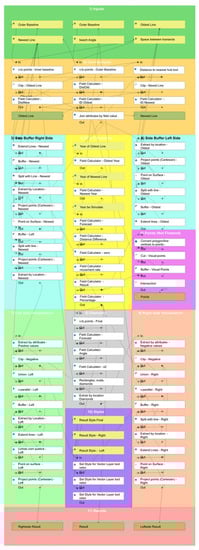 The tool was created on graphical modeler QGIS desktop version 3.4—Madeira, a low-code platform (development environment for application without complex code computations) that uses the tools of processing extension. The graphical modeler allows building complex models using a simple and easy canvas interface [57]. The model workflow is organized into three main groups: transects creation, calculations, and graphical results. The transects creation group includes the inputs of the model and the core analysis that perform the geometry operations to create the transects with the distance values from baseline. The following is the calculations group that operates geometric operations and the application of the EPR equation. In the end, the graphical group is composed of the EPR forecast visualization and the results vector outputs (Figure 2).