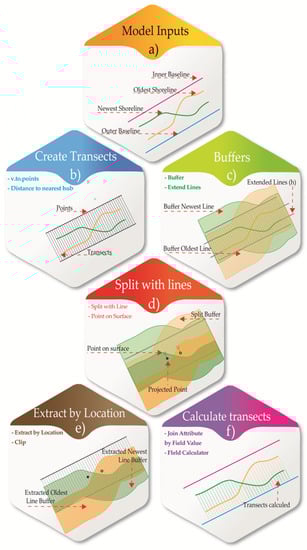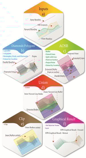 Graphical illustration of EPR4Q tool: (a) model inputs (oldest and newest shoreline, inner and outer baseline); (b) create transects (v.to.points tool, Distance to nearest hub tool); (c) buffers (Buffer tool, Extend Lines tool); (d) split with lines (Split with Line tool, Point on Surface tool); (e) extract by location (Extract by Location tool, Clip tool); (f) calculate transects (Join Attribute by Field Value tool, Field Calculator tool).
