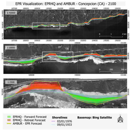 The tools AMBUR, EPR4Q, and DSAS, were performed successfully in all beaches of the study area, with a positive correlation between the tools. Furthermore, only AMBUR and EPR4Q have forecast visualization for the EPR method. Figure 5 serves as an example to demonstrate the result of the EPR4Q method visualization.