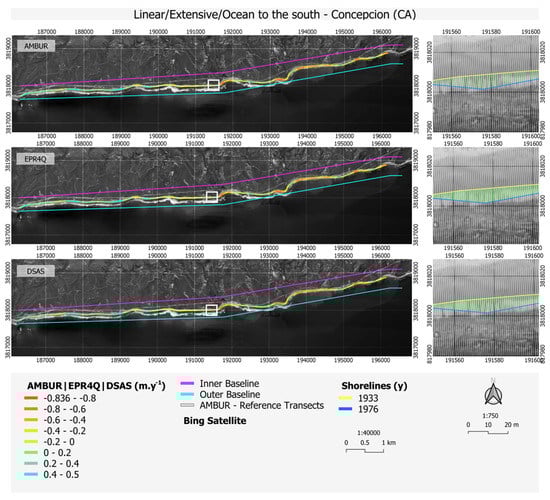 Shoreline changes in Concepcion using the AMBUR, EPR4Q and DSAS tools. White box shows the detail of transects with the reference transect (AMBUR unfiltered transects).