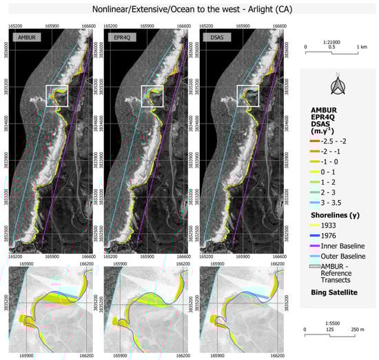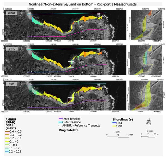Shoreline changes in Rockport using the AMBUR, EPR4Q, and DSAS tools. White box shows in detail the tools results with the reference transects (AMBUR no filtered transects).