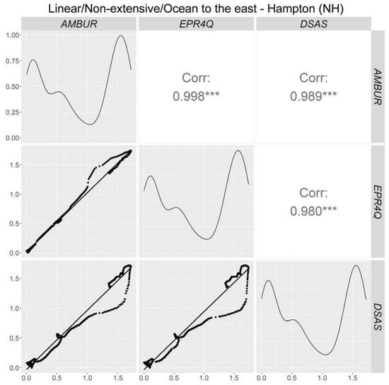 Matrix correlation of AMBUR, EPR4Q, and DSAS models on Linear/Non-extensive/Ocean to the east for Hampton coast. p-value significance symbols: “***”—0.001; “**”—0.01; “*”—0.05; “.”—0.1; No symbol —1. The matrix correlation shows the scatter plot between the models (EPR4Q × DSAS, EPR4Q × AMBUR, AMBUR × DSAS) on the left side. The frequency curve of the histogram of each model on diagonal and Pearson’s correlation is presented on the right.