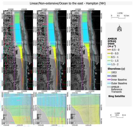 Shoreline changes in Hampton using the AMBUR, EPR4Q, and DSAS tools. White box shows in detail the tools results with the reference transects (AMBUR no filtered transects).