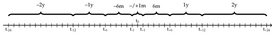 Summary time intervals for analyses. t0 defines the event. Variables were calculated for the displayed time intervals during the event, one, six, twelve and 24 months before and after.