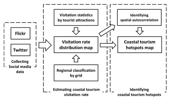 This research was conducted in three stages (Figure 1). In the first step, social media data were collected to estimate the spatial distribution of coastal tourism. Using the geo-information of social media data, it is possible to identify users’ spatial distribution in a wide area.