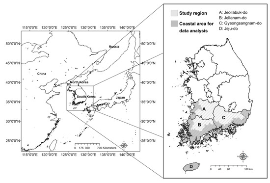 South Korea consists of nine provinces and eight metropolitan city districts (Figure 2). This study deals with regional spatial units smaller than national spatial units but larger than local and urban spatial units. As such, one province combined with metropolitan city districts located within the province is considered to be one region. This study focused on four regions: Jeollabuk-do, Jellanam-do, Gyeongsangnam-do, and Jeju-do. These regions are located south of the latitude 36° line (Figure 2). All four regions are adjacent to the ocean and have unique characteristics (Table 1).