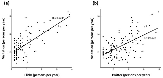 Correlation (a) between Flickr and visitation data (R = 0.7245, p < 0.001) and (b) between Twitter and visitation data (R = 0.5837, p < 0.001).