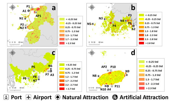 A hotspot generally refers to an area with higher values compared to its surroundings [45,46,47]. Tourist attractions and the areas surrounding them that are heavily visited and affect the surrounding space may be considered coastal tourism hotspots. As hotspots are determined from relative values, spatial autocorrelation and hotspot patterns differ according to the spatial unit [48]. Although certain grids are important hotspots in the local unit, they can be ignored in the regional and national units.