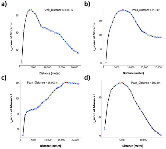 Z-score of Global Moran’s I by distance: (a) Jeollabuk-do (peak distance = 3603 m); (b) Jellanam-do (peak distance = 7603 m); (c) Gyeongsangnam-do (peak distance=16,903 m); (d) Jeju-do (peak distance = 5003 m).