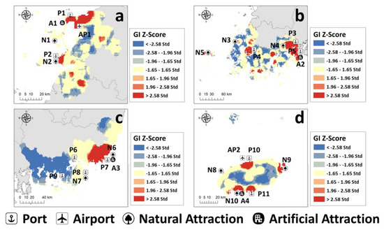 Coastal tourism hotspots at regional level: (a) Jeollabuk-do; (b) Jellanam-do; (c) Gyeongsangnam-do; (d) Jeju-do (Gi Z-score and the names of each facility and tourist attraction are referred to Appendix D).