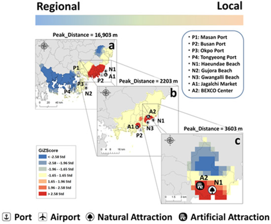 By deriving and comparing hotspots according to different spatial scales targeting the same area, various spatial contexts can be identified. If hotspot analysis is performed only on Busan city, hotspots may be identified around Haeundae Beach, Jagalchi Market, and Busan Port, which are major tourist attractions of Busan (Figure 7b,c). From the local perspective in Busan, major tourist attractions are hotspots for coastal tourism. However, from the regional or national perspective, Busan metropolis itself is a huge hotspot (Figure 7a). As such, the importance of places and the main targets to be considered are altered based on the spatial unit level. Therefore, it is important to conduct the analysis according to the viewpoints required for research and policy decisions.