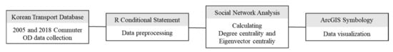 The analysis process is shown in Figure 1. First, data on the 2005 and 2018 commute OD were collected from the National Transportation Database. Next, we pre-processed the commuter traffic OD data using Rstudio, and measured the centrality using the network analysis package graph. Map visualization was done using ArcGIS. For more visually distinct results, the magnitude of degree centrality was categorized into eight classes, and eigenvector centrality up to seven decimal places was determined with six classes of centrality numerical fields.