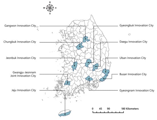 Innovation City (IC) projects refer to regional cities that integrate newly relocated institutions as part of the national balanced regional development strategy implemented in 2003. Specifically, this strategy was intended to tackle overcrowding in the metropolitan area surrounding Seoul and imbalanced growth in the rest of the country with the goal of developing 10 ICs by relocating government agency headquarters to 11 existing cities and provinces [1]. Starting with the 2003 announcement of the planned relocation of public institutions to provincial areas for balanced national development, the Innovation City Construction Policy prepared a legal basis for the development in 2004, followed by an announcement of the basic principles and measures for implementation. Next, a foundation for mutual cooperation was established, including collecting opinions from local governments and signing basic agreements between metropolitan and provincial areas, before selecting the city for the project in 2006. In 2006, candidate areas were selected for the development of ICs, and 153 government agencies were moved out of Seoul and its surrounding areas between 2007 and 2019, as scheduled [2].
