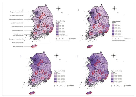 The Korea IC project policy assigns different development periods for each IC, thus it is more appropriate to compare and evaluate the data before and after the construction of an IC, rather than measuring annual changes. All public relocation of IC projects began after 2005, therefore there was no development effect in 2005. Similarly, all public relocations of IC projects were completed between 2013 and 2017, before 2018. Therefore, our analysis was based on pre-construction 2005 and post-construction 2018 to compare and analyze the post-centrality relationship indicating the location importance of the country, and identifying the regional structure before and after the construction.