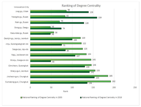 The changes in eigenvector centrality scores of IC (Table 5) were significantly different from those observed in degree centrality scores. While the overall distributions of the degree centrality rankings displayed a similar pattern in 2005 and 2018 in the regions of IC, the distributions of the eigenvector centrality ranks (Figure 5) showed significant difference during the same period. Among the regions of IC, Wonju in Gangwon Province ranked the highest at 85th place in 2005, followed by other regions that ranked between 100th and 200th places. In 2018, Jinju in South Gyeongsang Province ranked the highest at 5th place at the national level while most of the remaining regions ranked below 100. Thus, it was noted that eigenvector centrality of these IC significantly increased between 2005 and 2018, compared to the national average.