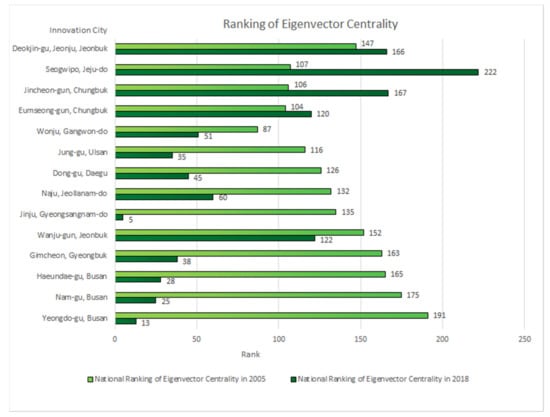 As shown in Table 5, only five out of 14 ICs saw increases in their eigenvector centrality between 2005 and 2018, indicating a rather insignificant increase. However, as shown in Figure 5, 10 out of the 14 regions of IC moved up in the corresponding rankings and that is a significant advance, when compared to the national average. Among IC, Dong-gu in Daegu, Jung-gu in Ulsan, Wonju in Gangwon, Wanju-gun, Iksan, and Muju-gun in North Jeolla Province saw their eigenvector centrality scores drop although they achieved a higher ranking at the national level. Thus, changes in eigenvector centrality of IC demonstrated contrasting results when compared to changes in degree centrality. This finding confirms that both centrality measures are different from each other in terms of concept and evaluation perspectives.