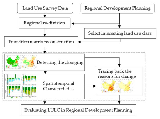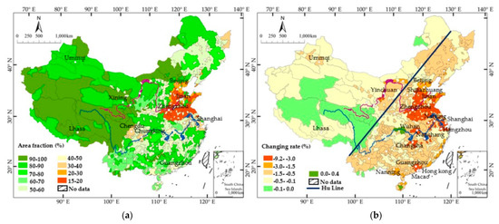 The changes in land use, which is a major driving factor of global and regional eco-logical changes, affect the ecosystem structure and process, either directly or indirectly, and induce the capacity change of the ecosystem that could supply us services [1,2,3,4,5]. Generally, land use could be identified into three types: (1) the natural ecological land (hereinafter referred to as ecological land) with natural attributions that coordinate the ecosystem, such as forest, grassland, wetland, etc.; (2) semi-natural land use types which accommodate human interaction with nature frequently, such as cropland, orchard, etc.; (3) land for human products, such as urban areas [6,7,8,9,10]. The concept of ecological land has been applied for the classification of land ecological function, land changes, ecosystem functions, etc. in a set of studies from the 1990s [11,12,13,14,15,16,17,18,19,20,21,22,23] and environmental management especially in China [2]. According to the researches above, the capacity and change of ecological land within a region indicate the change of the natural environment, the intensity of human disturbance, and the effects of spatial regulation implemented in the development planning.