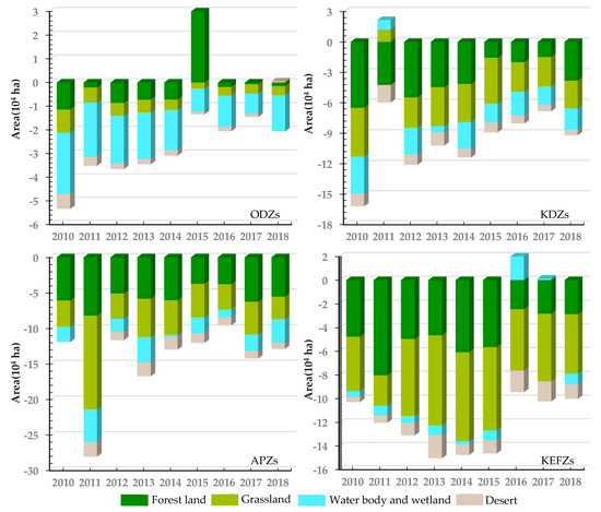 The decrease of ecological land types was significant in KDZs, APZs, and KEFZs, especially in APZs, where the decreased area for each ecological land type was the largest, up to 1.30 million ha. The decreases of wetland were greater than the other types in ODZs, KDZs, and APZs, especially in ODZs. The large population, relatively high development intensity, and climate change were inducing the decrease of wet-land in ODZs where the decrease area of wetland from 2009 to 2018 was almost equal to the area of wetland in KDZs, but the original area of wetland in ODZs was much smaller than that in KDZs. The areas of forest land, grassland, and bare land noticeably decreased from 2009 to 2018 in APZs.