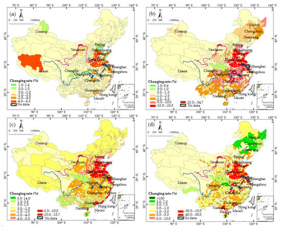 Similar to the grassland, the area of the wetland had also decreased significantly in most regions, mainly in North China. The rate of wetland decreased by more than 15% in KDZs around Zhengzhou. It was different from other land classes that the area of wetland increased in some regions, especially in the west and southwest regions. The maximum growth rate took place in KEFZs around Hainan (Figure 5c).