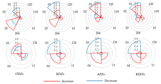 Figure 3 demonstrated the fraction and the changing rate of ecological land area from 2009 to 2018. It could be seen from Figure 3 that the area of the ecological land area was relatively large in the western and northwestern MFOZs as there was less human activity. The ecological land area in the ODZ was relatively less, the smallest area is 2 million ha in ODZs around Beijing, accounting for only 27% of the total area. As a whole, the ecological land area in the APZs and KEFZs was also comparatively large, which were significant ecological barriers in China. However, the fraction of ecological land was relatively less in the central regions which are mainly KDZs and APZs, such as KDZs around Zhengzhou and North of Shanghai, and APZs around Jinan and Zhengzhou. The fraction of ecological land of KEFZs was relatively higher than others.