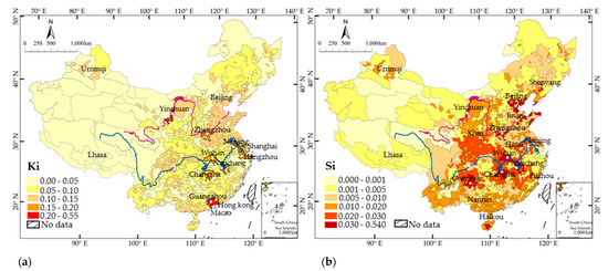 Additionally, we calculated the transforming rate (Si) between forest land, grassland, wetland, and bare land using Equation (3). The transforming rate could reveal the intensity of ecological land internal changed. The transforming rate was higher in ODZs and KDZs, such as ODZs around Shanghai, and Beijing, KDZs around Nanjing, Wuhan, Changsha, and Guiyang (Figure 7b) which revealed that some ecological protection projects had been carried out in these areas to improve the quality of ecological land [32,33]. The ecological land disturbed rate (Ki) was also relatively high in KDZs around Yinchuan (Figure 7a) which revealed that both construction and agricultural occupation and ecological degradation occurred in this area at the same time. In addition, it was a concern that ecological degradation had occurred in KEFZs around Hainan by comparing Figure 7a, Figure 7b and Figure 5. Some ecological lands were converted into bare land in KEFZs.