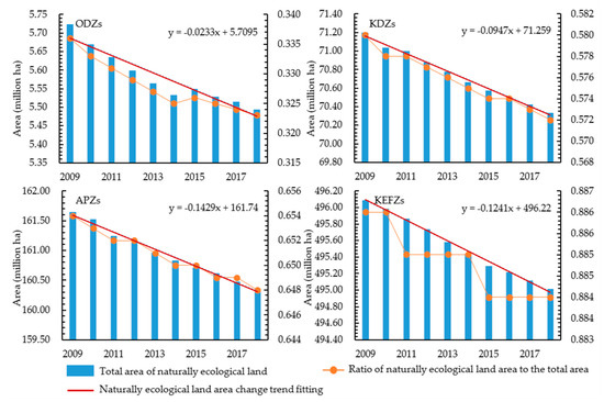 We calculated the area and the change rates of ecological land in ODZs, KDZs, APZs, and KEFZs shown in Figure 1. Using the land use data from the 2nd National Land Use Survey from 2009 to 2018. The total area of ecological lands in ODZs, KDZs, APZs, and KEFZs was 5.49, 70.33, 160.35, and 495.02 (million ha), respectively in 2018 (Table 2). The area of ecological land was the least in ODZs.