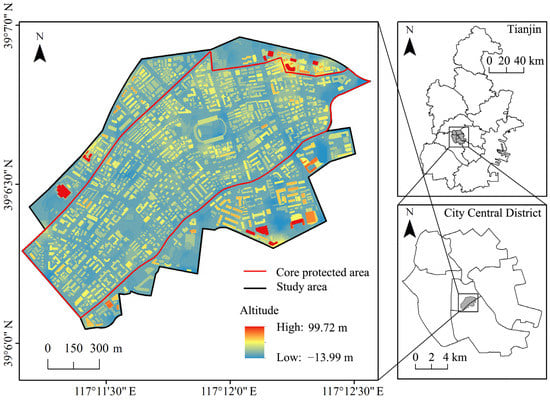 Case study area and geographic location of the Tianjin central district (Altitude refers to the heights of the buildings in relation to the ground level).