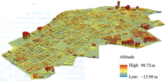 The evaluation criteria were calculated using the tools of ArcGIS software (Esri, V10.4). In the process of calculation, the resolution of a raster map was unified at 0.2 m × 0.2 m. Google high-definition images, field research, and related text materials were obtained, and data sorting and cleaning and screening work were performed. DEM and building contour vector data were used to construct a grid surface with buildings in the study area, namely an urban digital elevation model (UDEM) [30], which is the three-dimensional model for spatial analysis in this study (Figure 2).