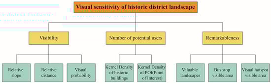 In this paper, a comprehensive assessment method of visual sensitivity of historic landscape is presented based on GIS technology. Building on the previous research methods, this study explored, improved, and innovated the type, scale, and assessment criterion of the research area of landscape visual sensitivity. First, the study area selected for the previous research on visual sensitivity is mainly forest landscape area, the type being rather simple, while this study selects the assessment object of the landscape visual sensitivity on the urban historic district rich in historical context. Second, previous research methods are often applied to larger research scales, and small and medium-scale visual sensitivity research is rather weak in this field. This study explores the feasibility of optimizing the common assessment criteria of the visual sensitivity of large-scale forest or urban landscapes for the visual sensitivity assessment of small- and medium-scale areas such as historic districts. Third, the assessment criteria selected in the past research are not closely integrated with the emerging open-source data. Different from the previous assessment model based on relative slope, relative distance, visual probability, valuable landscape, and other assessment criteria, we added historic building information, POI, Dianping, and other open network data to the sub-criteria. The number of potential users criterion, which is composed of historic building kernel density and POI kernel density, can be more regionally targeted than the previous assessment criterion for natural or urban landscapes, and the results obtained are more timely. While doing an objective assessment of historic districts, through the addition of Dianping data, the subjective assessment factors of the public are integrated into the assessment model. Through the addition of these indicators, the feasibility of combining subjective and objective assessment factors, traditional data, and open network data for visual sensitivity assessment is explored.