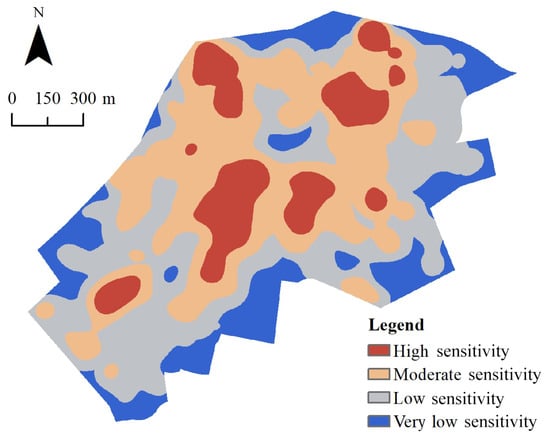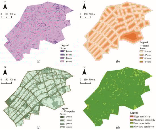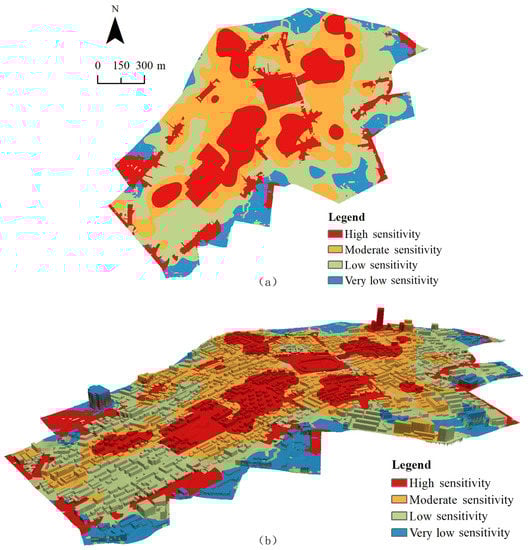 The superposition process of visual sensitivity results at all levels based on the main and sub-criteria can be regarded as the process of taking the minimum and maximum values. Therefore, the overall visual sensitivity indicator of historic districts can also be superimposed according to Formula (6) to calculate the most likely visual sensitivity of each cell in the study area. Thus, the results are divided into four levels: high sensitivity, moderate sensitivity, low sensitivity, and very low sensitivity.