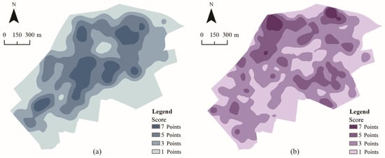 (a) Kernel Density of historic-building-based sensitivity criteria; (b) Kernel Density of point of interest (POI)-based sensitivity criteria.