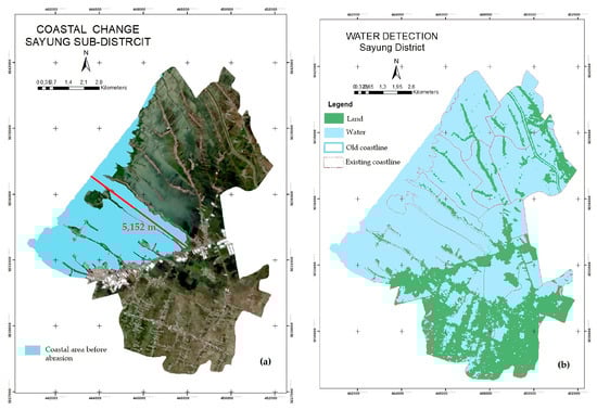 (a) Illustration of shoreline retreat area in the Sayung subdistrict (blue), overlaid on an image from Landsat 8 Oli on 29 July 2020 and [28]; (b) water detection of Sayung subdistrict based on normalized difference water index (NDWI) according to an image from Landsat 8 Oli 29 July 2020, which may correlate with the inundation problems.