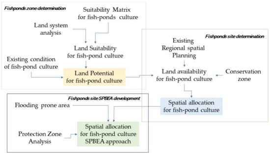 A multicriteria analysis (MCA) was incorporated into the GIS environment to develop a model [34]. The SPBEA model was developed in three steps (Figure 3). The first was the fishpond zone determination sub-model, which involved an analytical hierarchy process (AHP) method in model development. The output of this step was the land potential for fishponds. The second was the fishpond site determination, where the output was the model of spatial allocation for fishponds. The third step was the SPBEA fishpond site development, with the output being the SPBEA site management planning model.