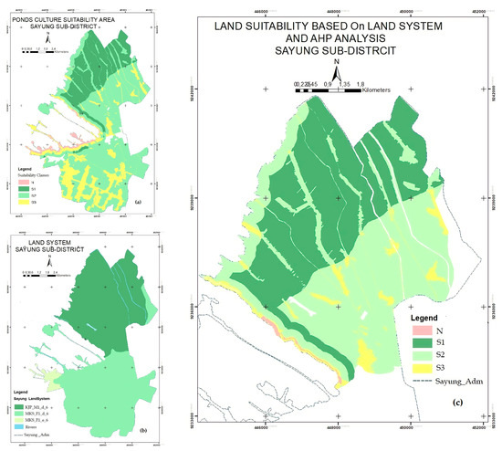 The result of GIS analysis for land suitability-based AHP showed that the fishpond culture zone could be classified into highly suitable (S1), moderately suitable (S2), marginally suitable (S3), and unsuitable (N) (Figure 4a). However, there were spatial differences in the distribution of pond culture when the assessment of the land systems was applied (Figure 4c). Each unit in the land system classified the landscape according to the principles of ecology, where it was assumed that there was a close relationship among the lithology, hydroclimate, landforms, soil, and organisms [41,47,48].
