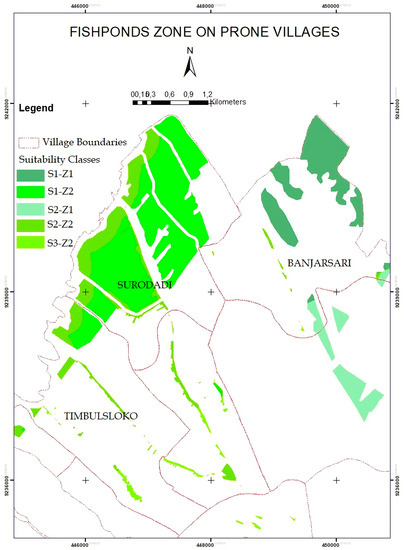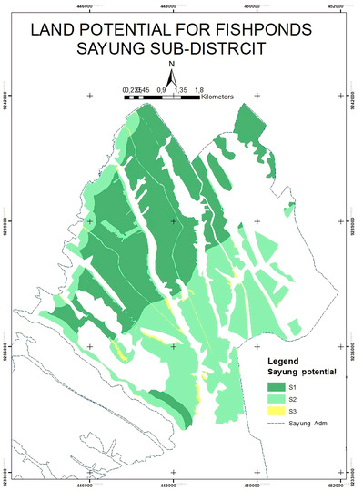 By considering the conditions of the ponds, the GIS analysis of the potential land for fishpond cultivation is shown in Figure 5. This potential fishpond planning was supported by the multiyear fishpond activities, whereby the livelihood of the local community depends on aquaculture land, which consists of 750 hectares and has produced milkfish and shrimp since 1995 [50].