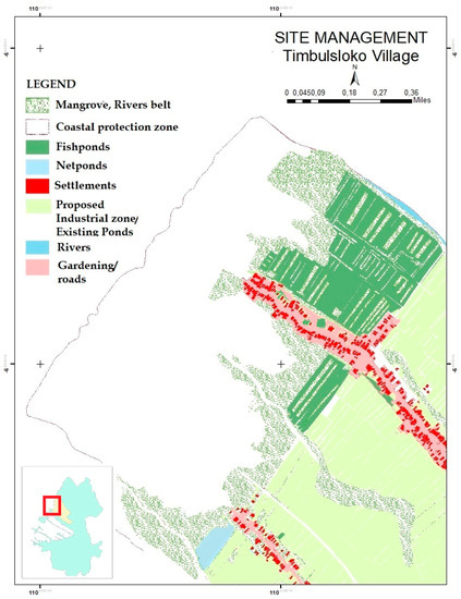 As an area prone to coastal inundation, the SPBEA model of Timbulsloko has to consider the features of the protection zone, the coastal and river belt zone, the fishpond and net pond zone, and the settlement and its infrastructure zone in its detailed spatial analysis. These features were identified as the result of field observation, whereby the village can be spatially designed as a fishing village. In addition to being able to maintain the culture and lifestyle of coastal communities which are dependent on aquaculture, a rural fishing village can also be an attraction for ecotourism. The authors of [60,61] support the claim that fisheries and tourism create benefits for the local community because a fishing village has the potential to develop as a destination for marine tourism. Indeed, findings from [62] also support that fishing-based coastal village planning is a valid approach for strengthening the economy of coastal communities. The result of SPBEA analysis by using a visual interpretation of high-resolution images integrated with the detailed analysis of the spatial allocation can be seen in Figure 8.