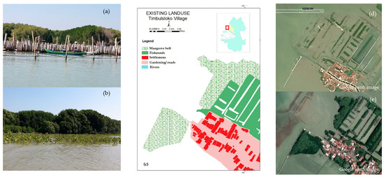 An example of how the cultivation of the fishponds can be implemented with environmental adaptation: (a,d) the hybrid engineering technique, developed as trap sediments; (b) mangrove belt development as a protection zone for fishpond culture and rural community activities; (c) spatial illustration of Timbulsloko in applying hybrid technology and silvofisheries; (e) how the mangrove belt and silvofisheries have been developed.