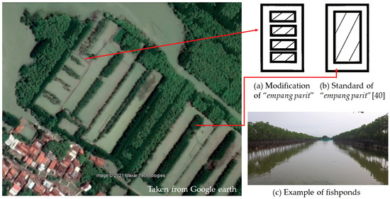 The most suitable fishpond management method for this purpose is the silvofishery method, as can be visually interpreted. The authors of [3] proved that the ecosystem adaptation of silvofisheries has succeeded in increasing not only the economic value of fish farms but also the value of the environment, through what is described as an economic–ecologic approach. In Timbulskolo, several pond farmers have begun putting this concept into practice, as seen in Figure 10.