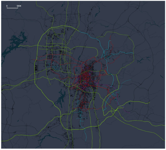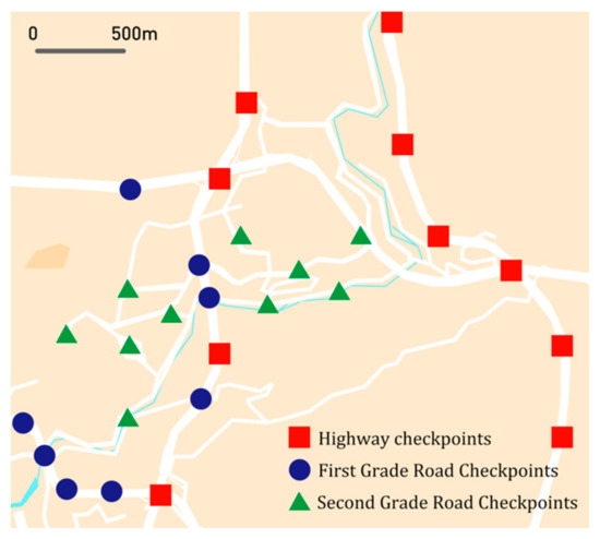 The grade of road is divided according to its use function and suitable traffic volume. The grade of roads in different countries is generally similar, but the classification indexes are not identical. Roads in mainland China are divided into five grades: highway, first grade road, second grade road, third grade road and fourth grade road [49]. Urban road video surveillance cameras are distributed on expressways, first grade roads, and second grade roads, as shown in Figure 2 [51].