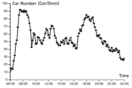 This paper selects East Qianling Road, a four-lane second grade road to verify the detection standard, the maximum traffic flow limit of road design capacity is 30,000, the speed limit on the road is 50 km per hour. According to the road traffic volume data detected by the road video surveillance camera, statistics are made every 5 min to calculate the number of vehicles passing this road Section 5 min before the time to represent the road traffic volume, as illustrated in Figure 3.