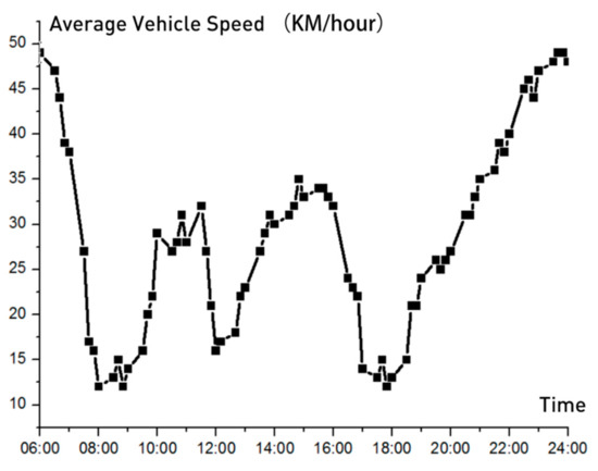 Road capacity ratio refers to the ratio of the actual traffic flow and the maximum traffic flow that the road is designed to withstand. In the equation, represents the actual road traffic flow and represents the maximum traffic flow limit of road design capacity [49].