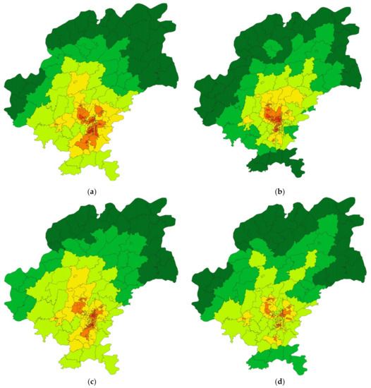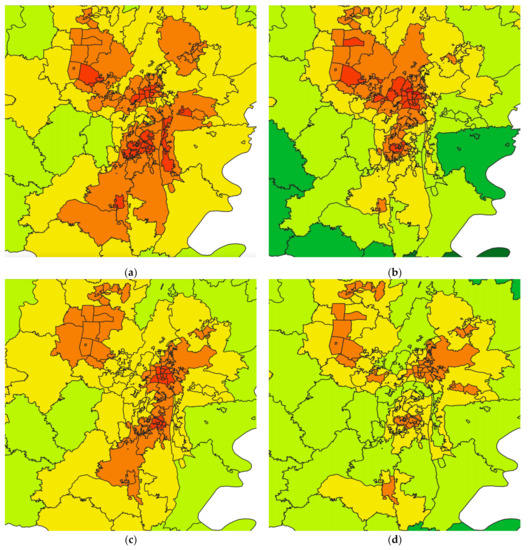 Visualization map of urban regional vehicle density in areas of Guiyang. (a) Traffic conditions at 8 o’clock. (b) Traffic conditions at 12 o’clock. (c) Traffic conditions at 18 o’clock. (d) Traffic conditions at 22 o’clock.