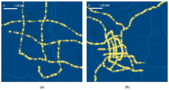 Visualization map of urban hot routes in areas with high vehicle density. (a) Hot routes in the west part of Guiyang. (b) Hot routes in the east part of Guiyang.