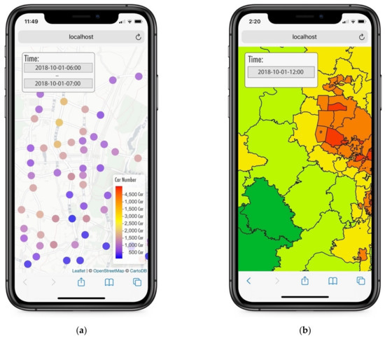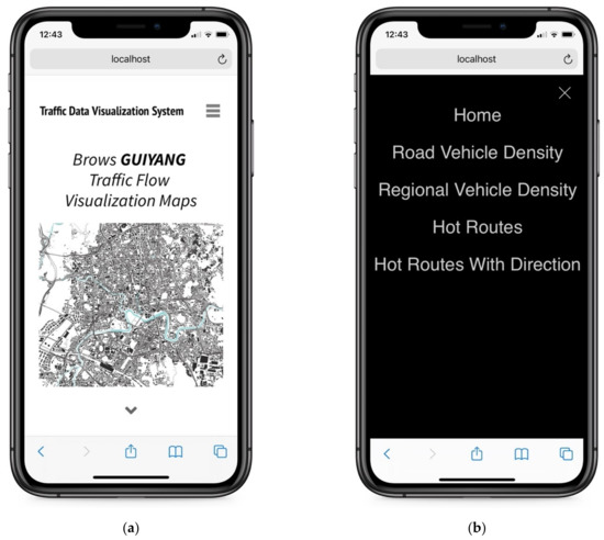 Figure 12 shows two interfaces for the road vehicle density visualization map and the regional vehicle density visualization map. User can type in a one-hour time period to check the vehicle density on urban road during that time span, the road vehicle density situation around Guiyang North Railway Station from 06:00 to 07:00 on 1 October 2018 is displayed in Figure 12a. User can also enter a specific hour time to examine the regional vehicle density information at that time, the vehicle density situation in Baiyun District at 12:00 on 1 October 2018 is displayed in Figure 12b. User can also interactively explore the analysis results of the urban hot routes visualization map as shown in Figure 13. All these map interfaces can be dragged or zoomed in and out by the user on a smartphone.