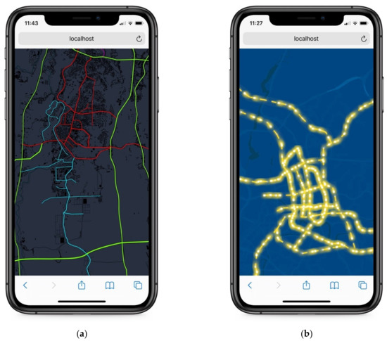 The interfaces for visualization maps. (a) Interface for the shape of roads with high occupancy. (b) Interface for 15 hot lines in urban areas with high vehicle density.
