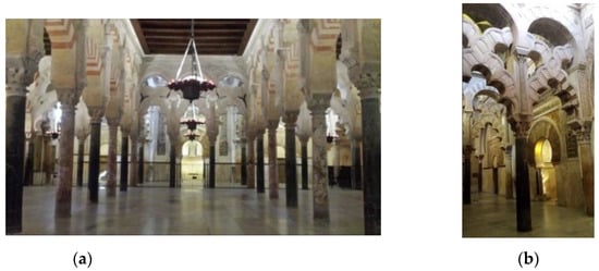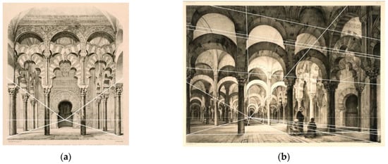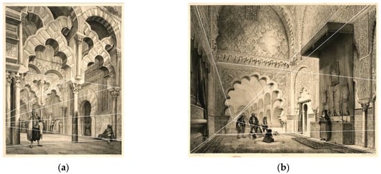 Prangey’s two most significant interior perspectives focused on the surroundings of the Mosque mihrab. One of them, more general (plate 5; Figure 7a), comprises the forest of columns and the double horseshoe arches. The other one (plate 7; Figure 7b) is closest to the mihrab and frames its intertwined arches.