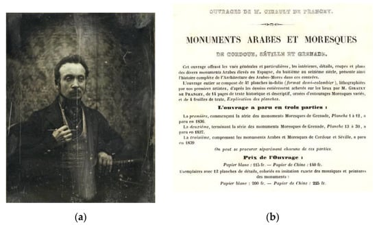 Joseph Philibert Girault de Prangey (1804–1892) was a draughtsman, pioneering photographer and scholar of Islamic architecture (Figure 4a). The museum in his hometown, Langres (France), devoted a small book to him in 1998 [] and, in 2020, the museum held an exhibition with a catalogue that provides abundant information and illustrates the artist’s solid education []. Prangey studied at the École des Beaux-Arts in Paris. He inherited a great fortune that allowed him to travel and indulge his interest in Islamic architecture. He took a trip to Italy in 1831 and others to Tunisia, Algeria, Spain and Sicily between 1832 and 1833.