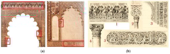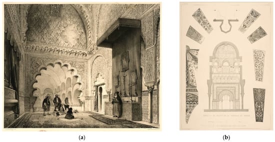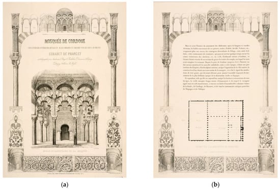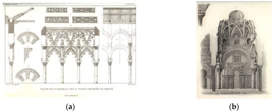 In “Monuments arabes et moresques de Cordoue…” (1839) [], a view of the mihrab lithographed by Asselineau (Figure 5a) appears on the cover. The plates’ edges are composed of details and ornaments of the building.