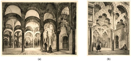 The first scaled plans of the monument were published by the Real Academia de Bellas Artes de San Fernando in Madrid in “Las Antigüedades Árabes de España” (1787–1804) []. The first interior perspective appeared in Henry Swinburne’s book, “Travels through Spain, in the Years 1775 and 1776” (1779) []. The first collection of views was published in Alexandre Laborde’s book, “Voyage pittoresque et historique de l’Espagne” (1812, t. II) []. In the first third of the 19th century, the views of James C. Murphy were remarkable in “The Arabian Antiquities of Spain” (1813) [], as were the ones by Isidore Taylor in “Voyage pittoresque en Espagne, et Portugal, et sur la cote d’Afrique” (1826–1832–1860) [].