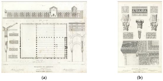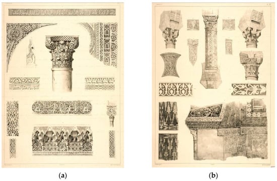 Furthermore, in Jules Gailhabaud’s work, “Monuments anciens et modernes…” (c. 1845) [], there are five plates of the Mosque-Cathedral: three views copied from other authors; one with a general plan and section including details, drawn by J. Jourdan and based on Prangey (Figure 12a); and another with details drawn by Prangey and Niel (Figure 12b).